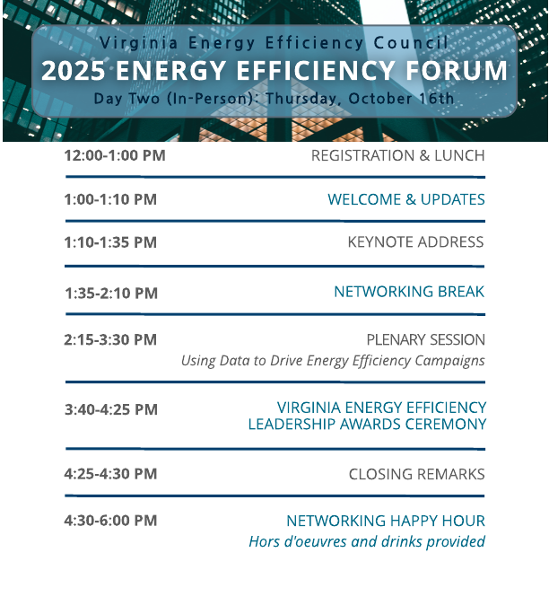 Join us for our annual Energy Efficiency Forum and Virginia Energy Efficiency Leadership Awards Ceremony. This is a two-day, hybrid event connecting Virginia's energy efficiency industry leaders through ample networking opportunities, showcasing success stories, and sharing educational content.